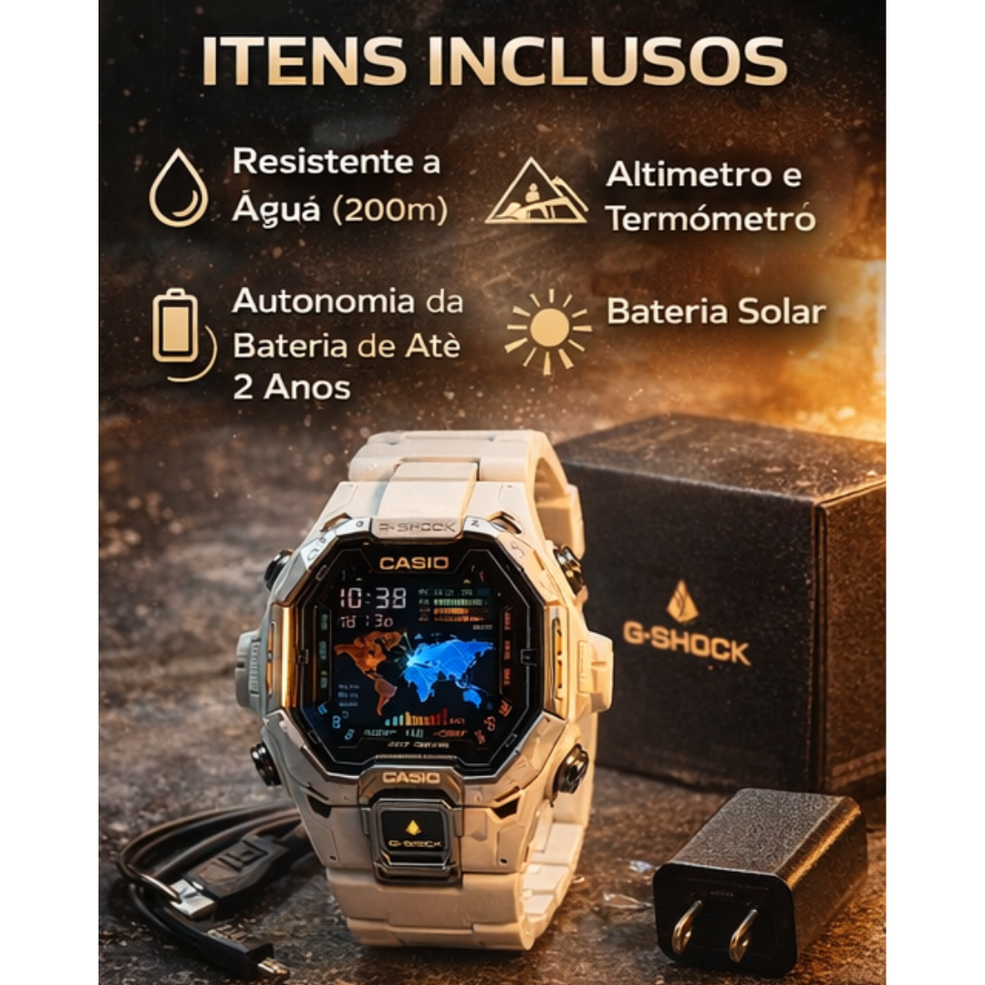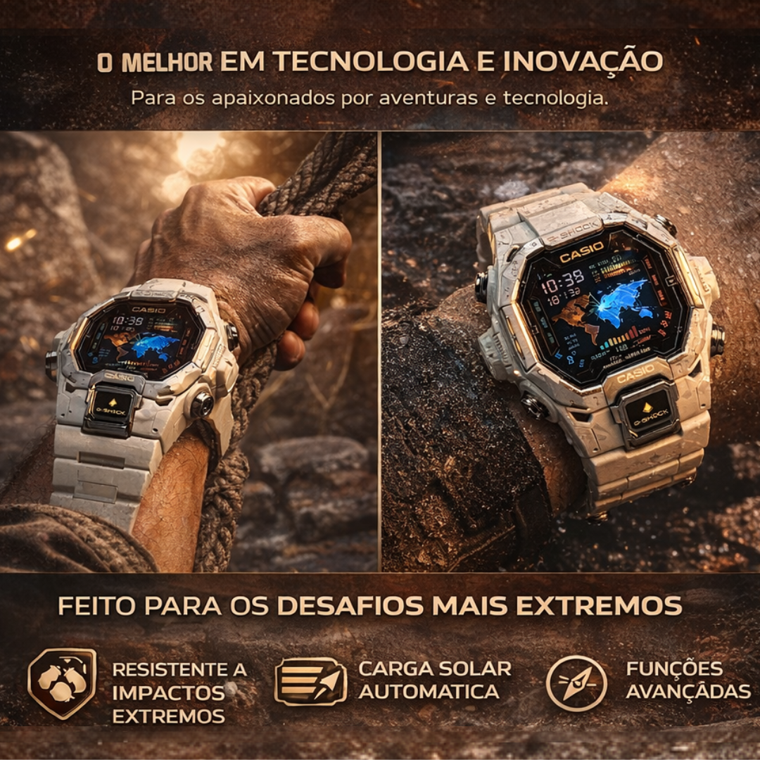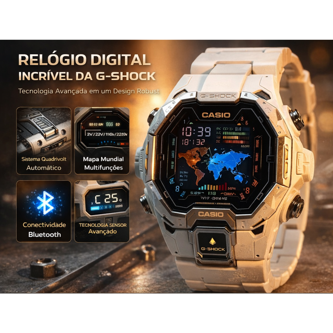 Estoque limitado. Garanta agora o seu Relógio G-SᏂock Ultra Resistente com Bluetooth e Energia Solar e experimente a combinação perfeita entre resistência, tecnologia e estilo.
